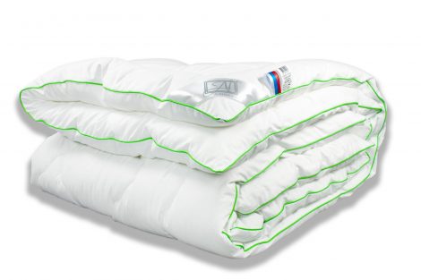 одеяло с наполнителем из бамбукового волокна 300 г/кв.м, чехол (100% хлопок) — бязь Гост белая, кант атласный, уголок, бирка, флажок, постер, в чемодане