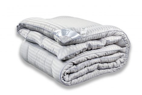 одеяло с наполнителем из микроволокна Лебяжий пух 300 г/кв.м, чехол — микрофибра Софт-Страйп с Вискозой кант атласный, бирка, постер, в чемодане