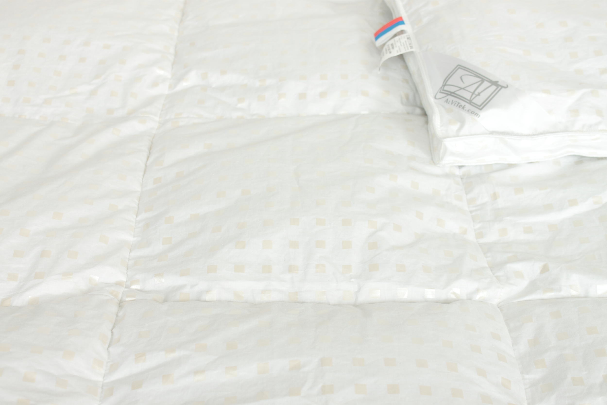 одеяло с наполнителем из 100% гусиного пуха (категории Люкс), чехол касетный с бортом- ткань пуходержащий тик(хлопок 100%), кант — атласный, уголок, бирка, флажок, постер, в чемодане