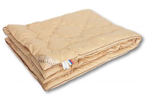 одеяло с наполнителем из верблюжьего пуха 400 г/кв.м, чехол (хлопок 100%)- ткань пуходержащий сатин (шоколадный) , кант — атласный, уголок, бирка, флажок, постер, в чемодане