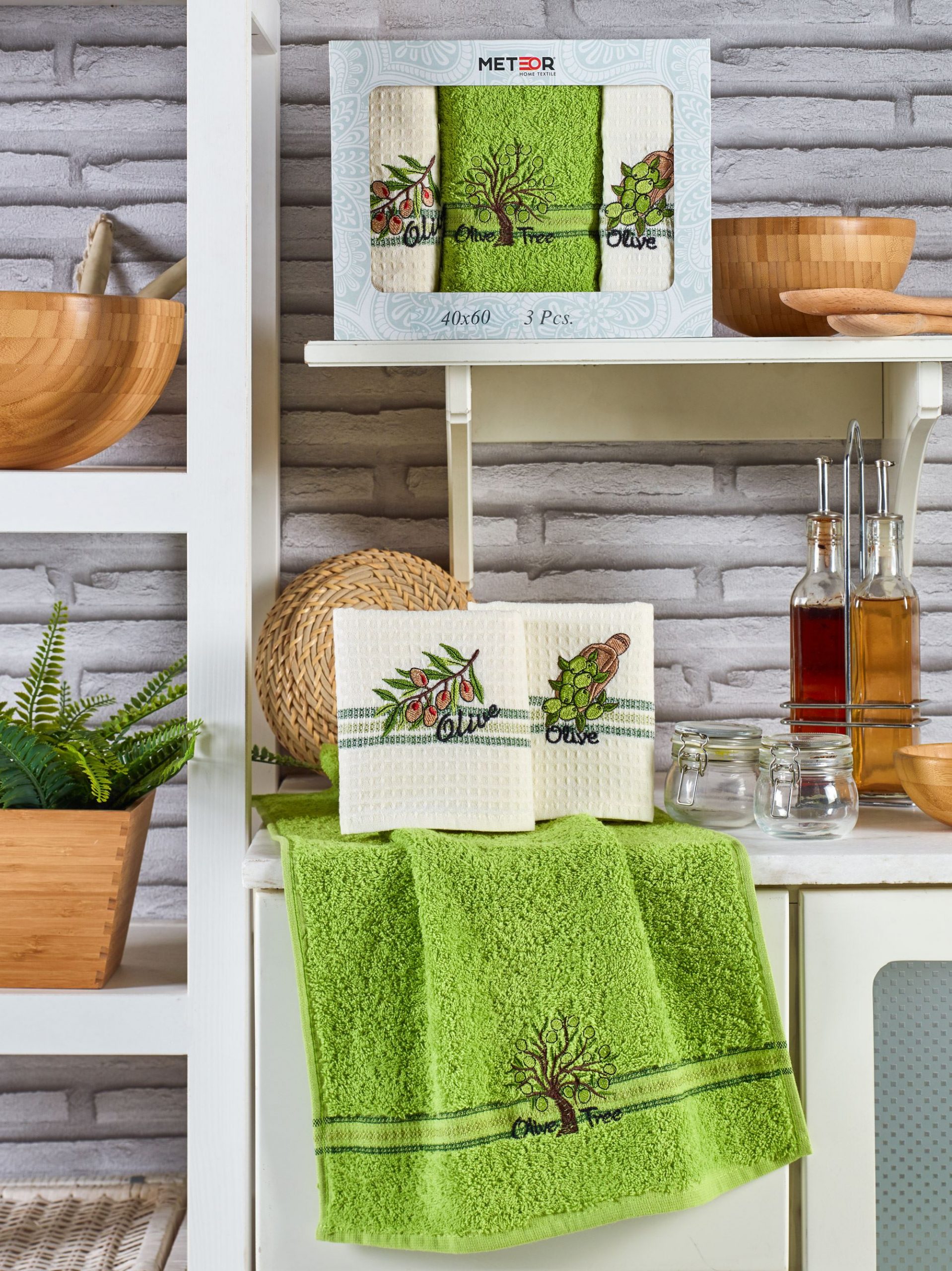 11007 MIMOZA ZEYTINL Махра-Вафля (40х60)х3шт в коробке Набор кухонный Метеор