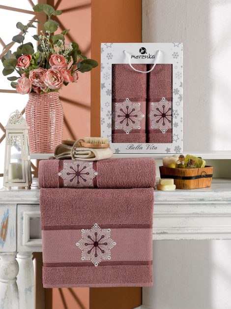 11615 Брусничный BELLA VITA махра (50х90+70х140 ) в коробке Набор полотенец MERZUKA
