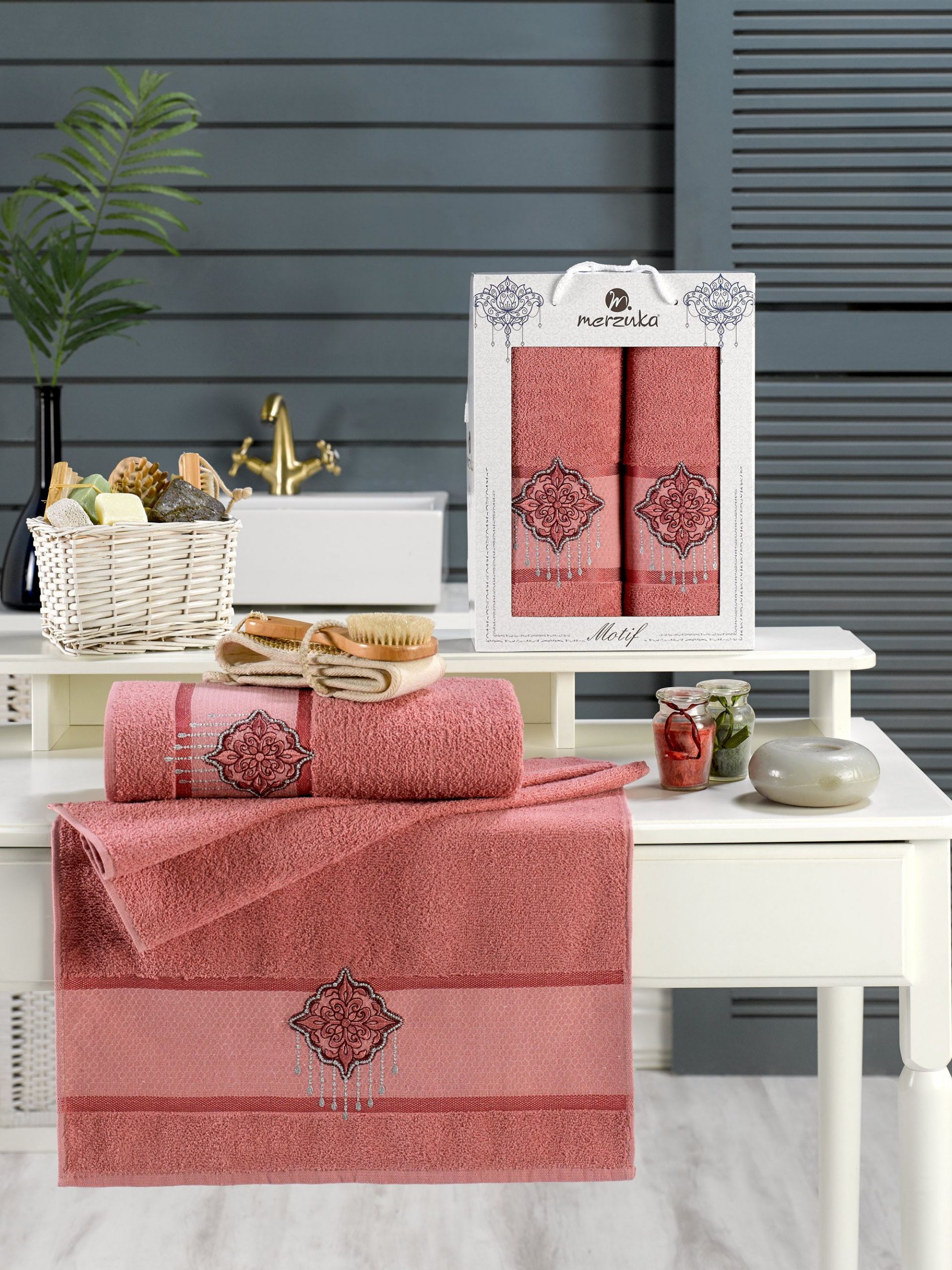 Заказать звонок11635 Тёмно-розовый MOTIF махра (50х90+70х140 ) в коробке Набор полотенец MERZUKA